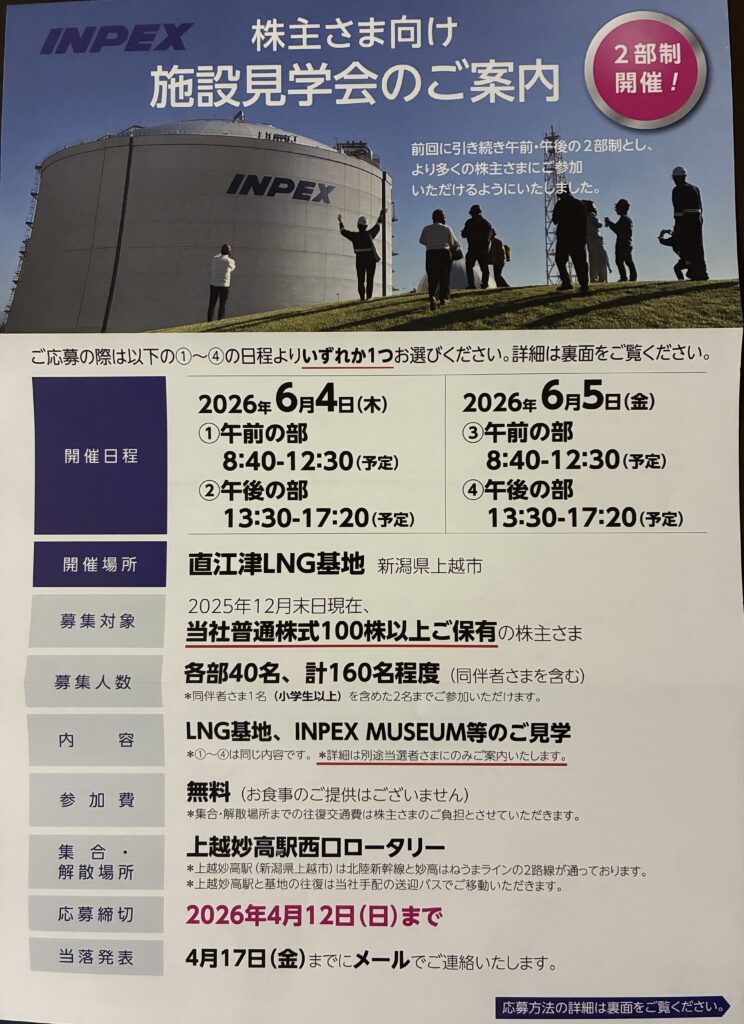 INPEXから、株主向けの施設見学会の案内が届きました。