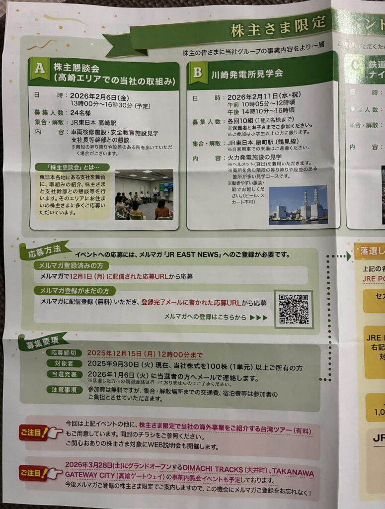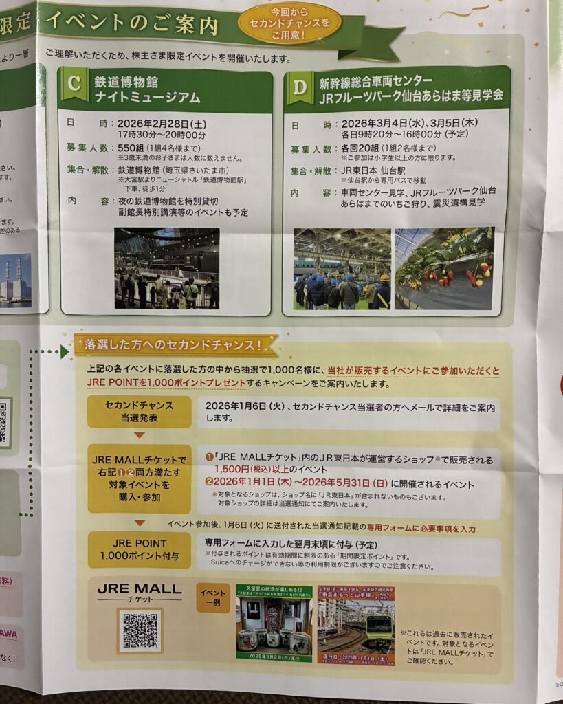 株主優待券の割引だけでなく「体験型イベント」が充実しているのは、JR東日本ならではの魅力です。