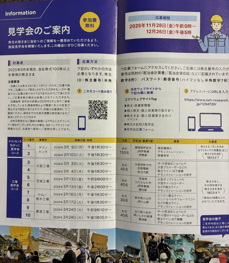 コマツ(小松製作所)から、株主向けの工場見学会の案内が届きました。いわゆる「株主優待」と明言されている制度ではありませんが、一般には開放されていない施設を見学できるという意味では、実質的に株主向け特典と言ってよい内容です。