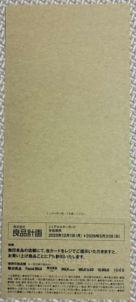 無印良品(MUJI)の株主優待、「シェアホルダーカード」が届きました。今回のカードは2025年12月1日~2026年5月31日まで有効で、全国の無印良品店舗での買い物が7%オフになります。