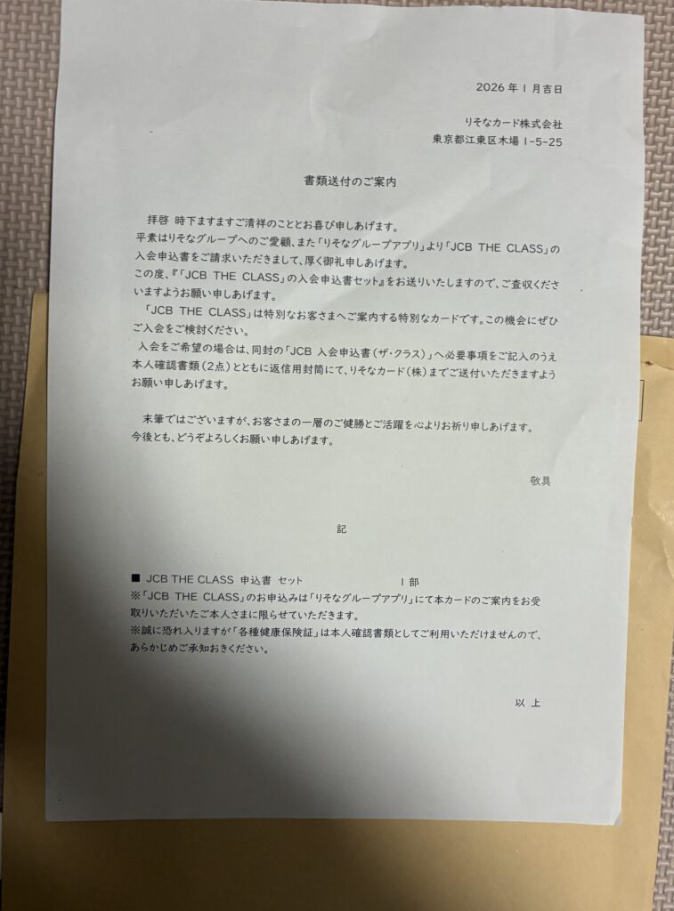 先日、埼玉りそな銀行から JCBザ・クラスのインビテーション(招待状) が郵送で届きました。