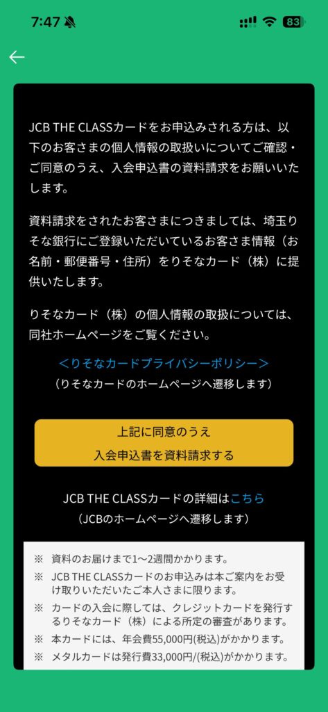 詳細を見ようとしてタップしただけで、JCBザ・クラスの資料請求が完了しました。