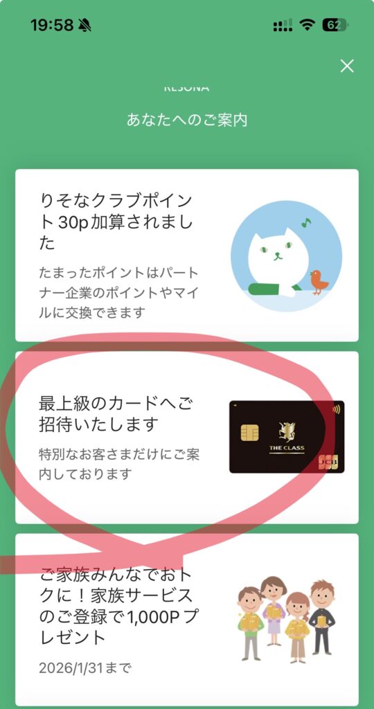 - 埼玉りそな銀行のりそなアプリにJCBザ・クラスのインビ通知が届いた