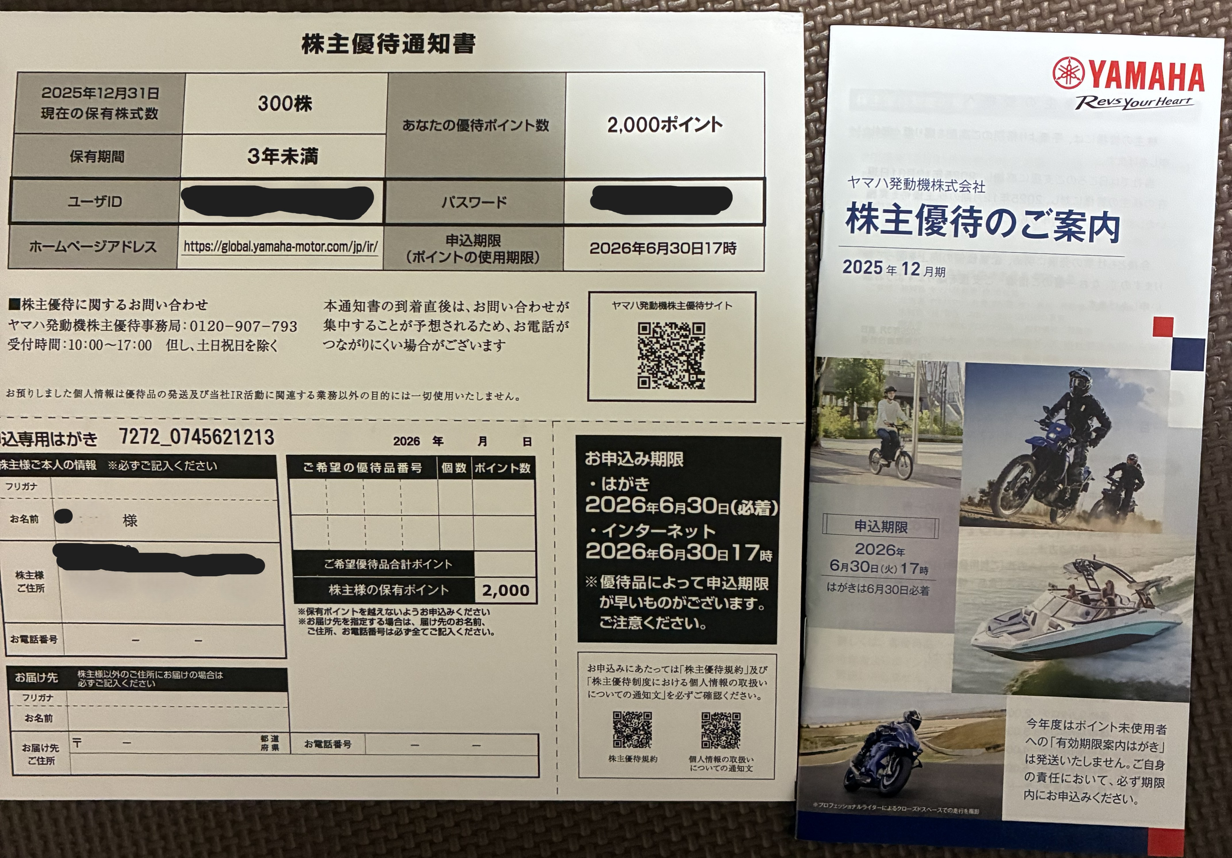 ヤマハ発動機の株主優待カタログが到着!300株で2000ポイント、Amazonギフトカードを選択しました