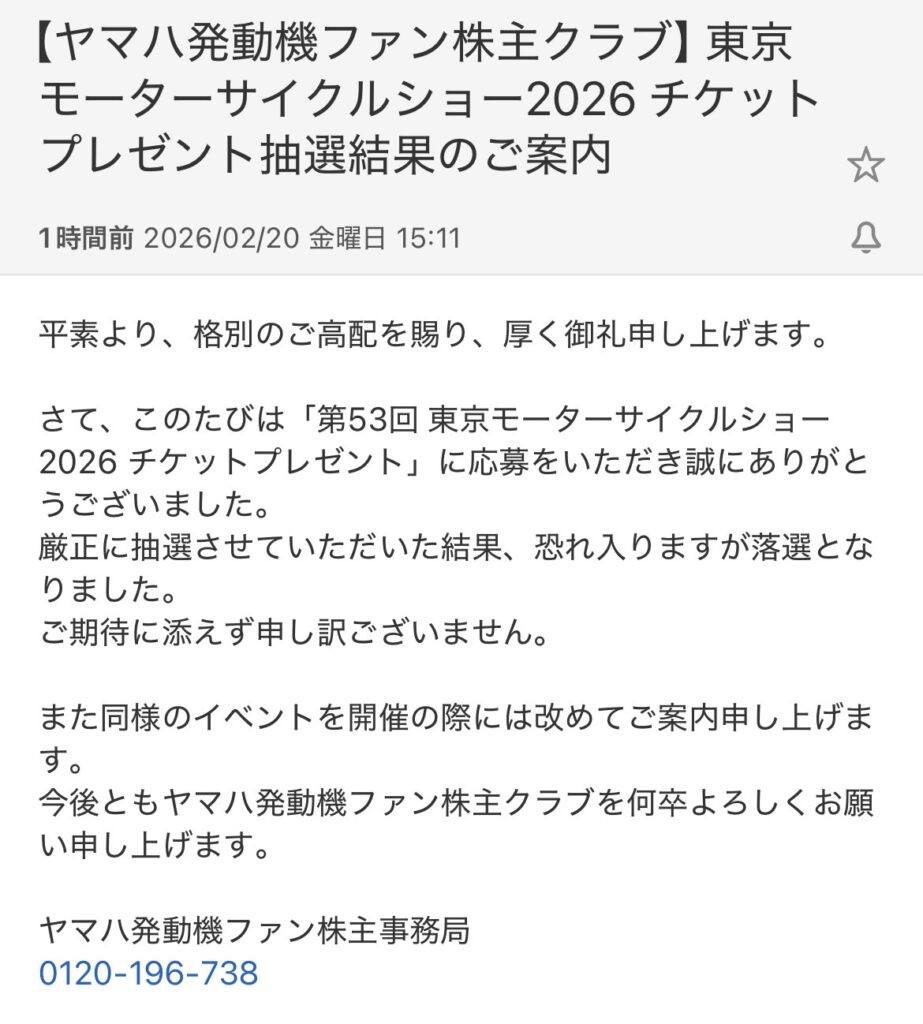 先日応募していたヤマハ発動機ファン株主クラブのイベントチケット抽選ですが、結果は――落選でした。